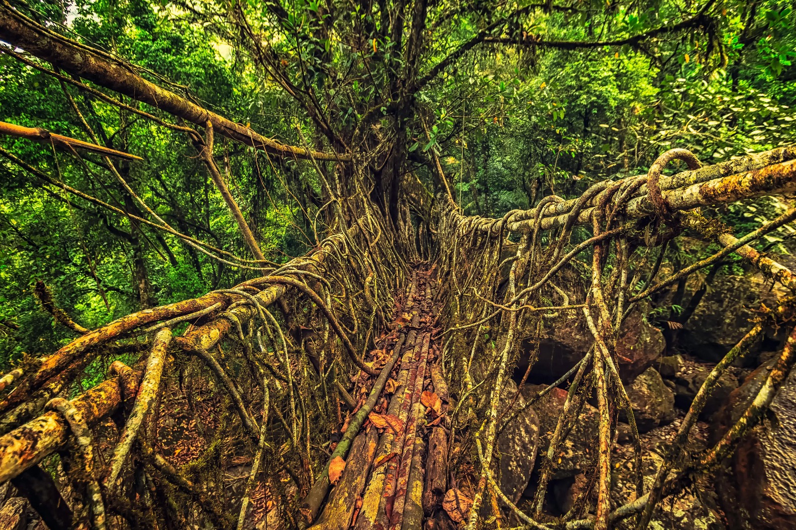 After breakfast drive to Mawlynnong, the cleanest village in Asia, also known as ‘God’s own Garden’. With over 80 households, the village gives the ambiance of walking in a well maintained park ! Climb the 80 ft Sky Walk at Mawlynnong village for a bird’s eye view of the Village, the plantations and faraway plains of Bangladesh. You will also be acquainted with the Khasi lifestyle, their culture and economy.